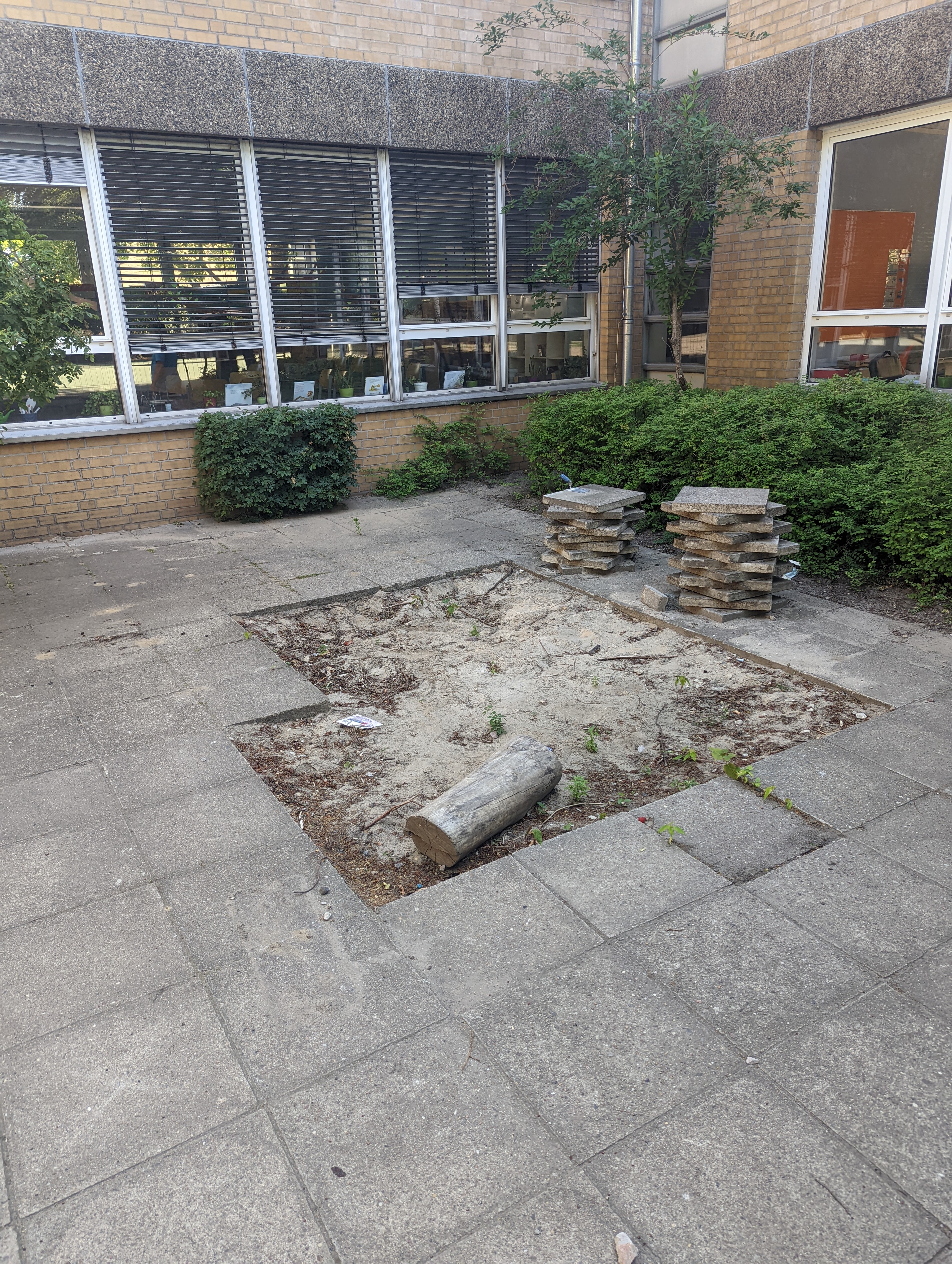 Auf Anregung eines Elternteils und in enger Zusammenarbeit zwischen Eltern, Schule und Hausmeister wurde im Juli 2022 ein Schachbrett auf dem Schulhof realisiert.