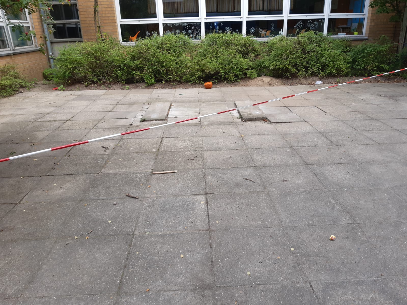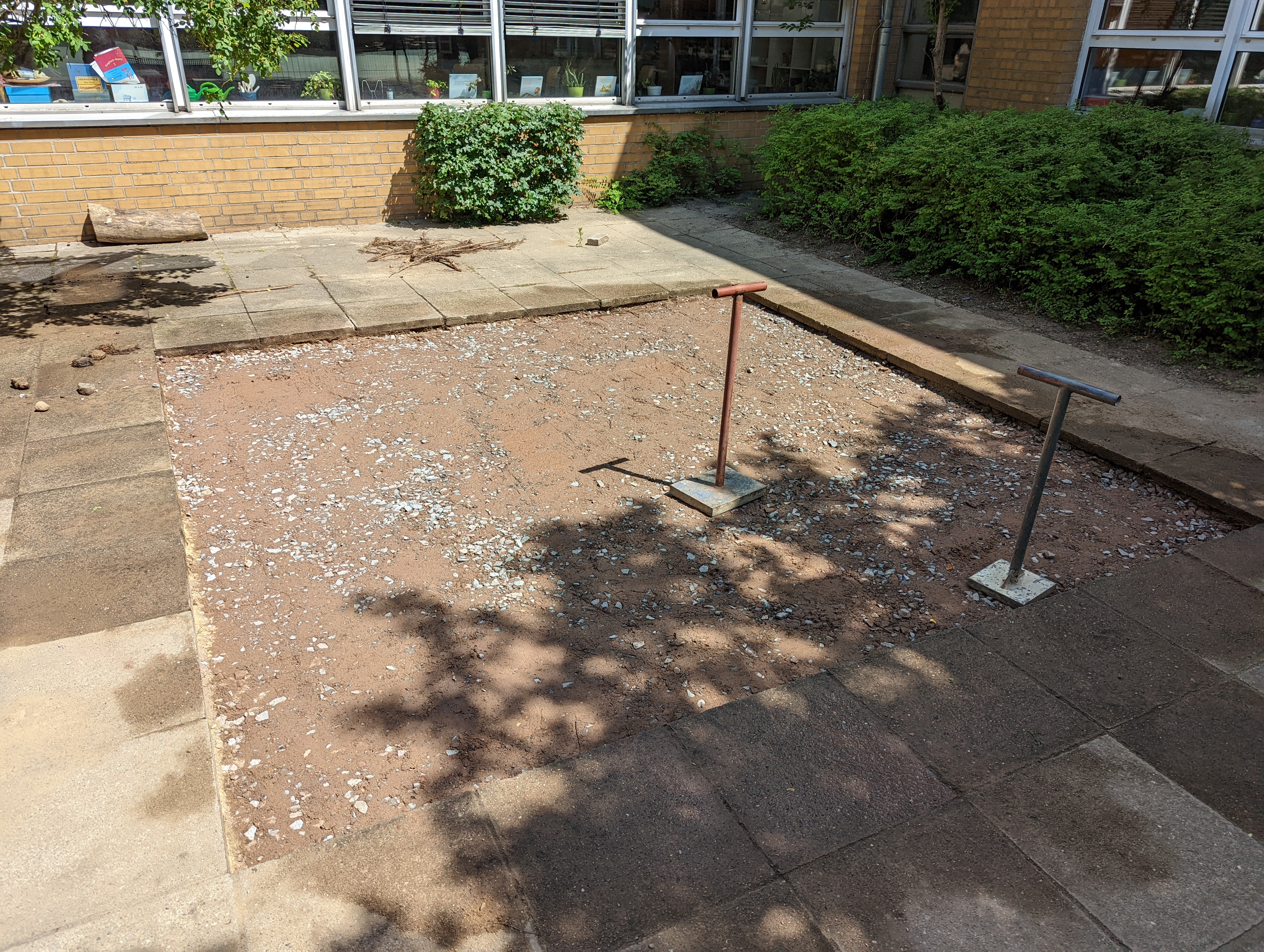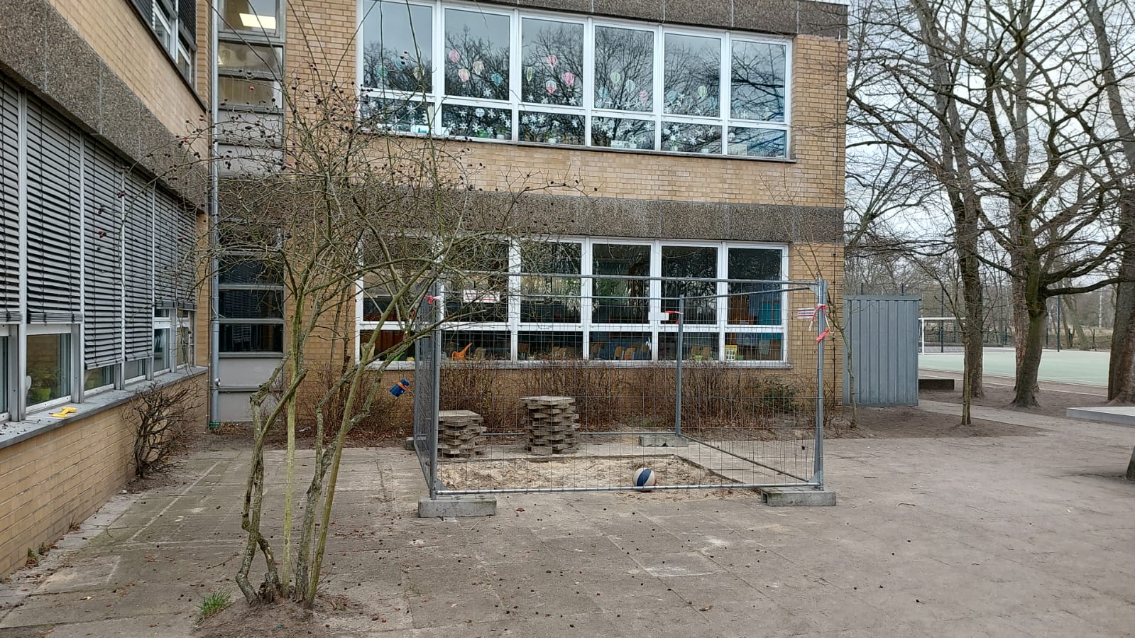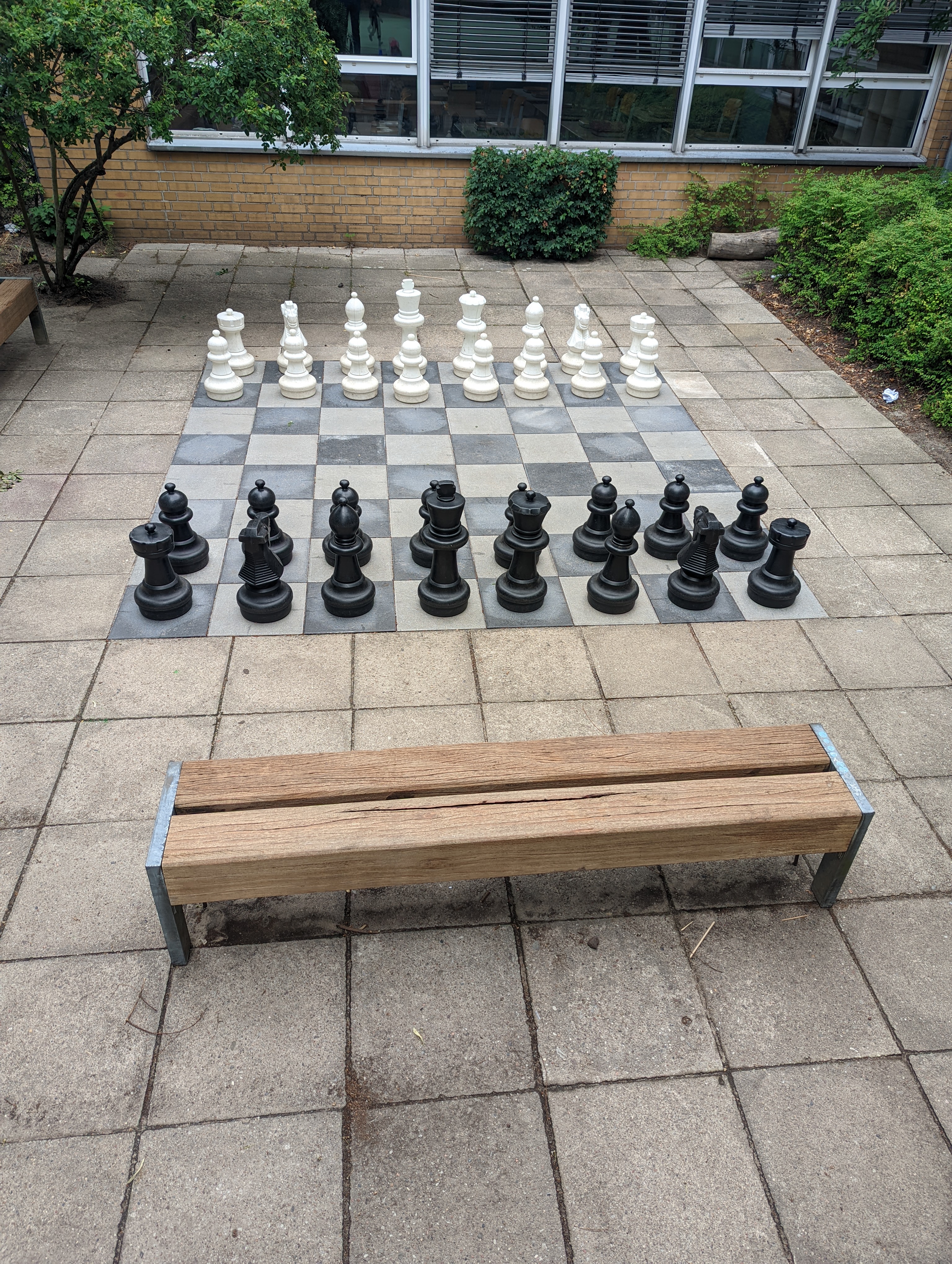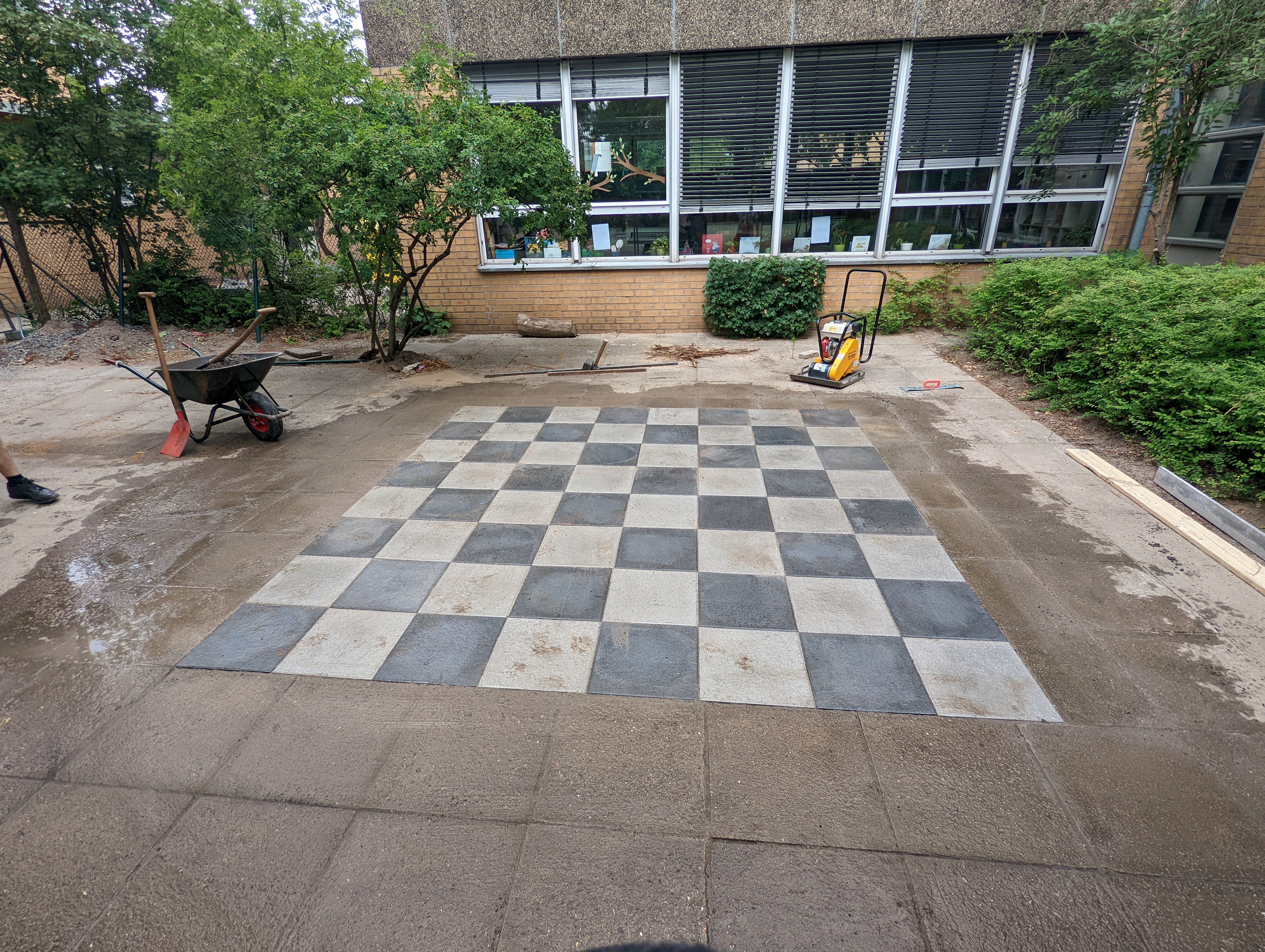 Auf Anregung eines Elternteils und in enger Zusammenarbeit zwischen Eltern, Schule und Hausmeister wurde im Juli 2022 ein Schachbrett auf dem Schulhof realisiert.