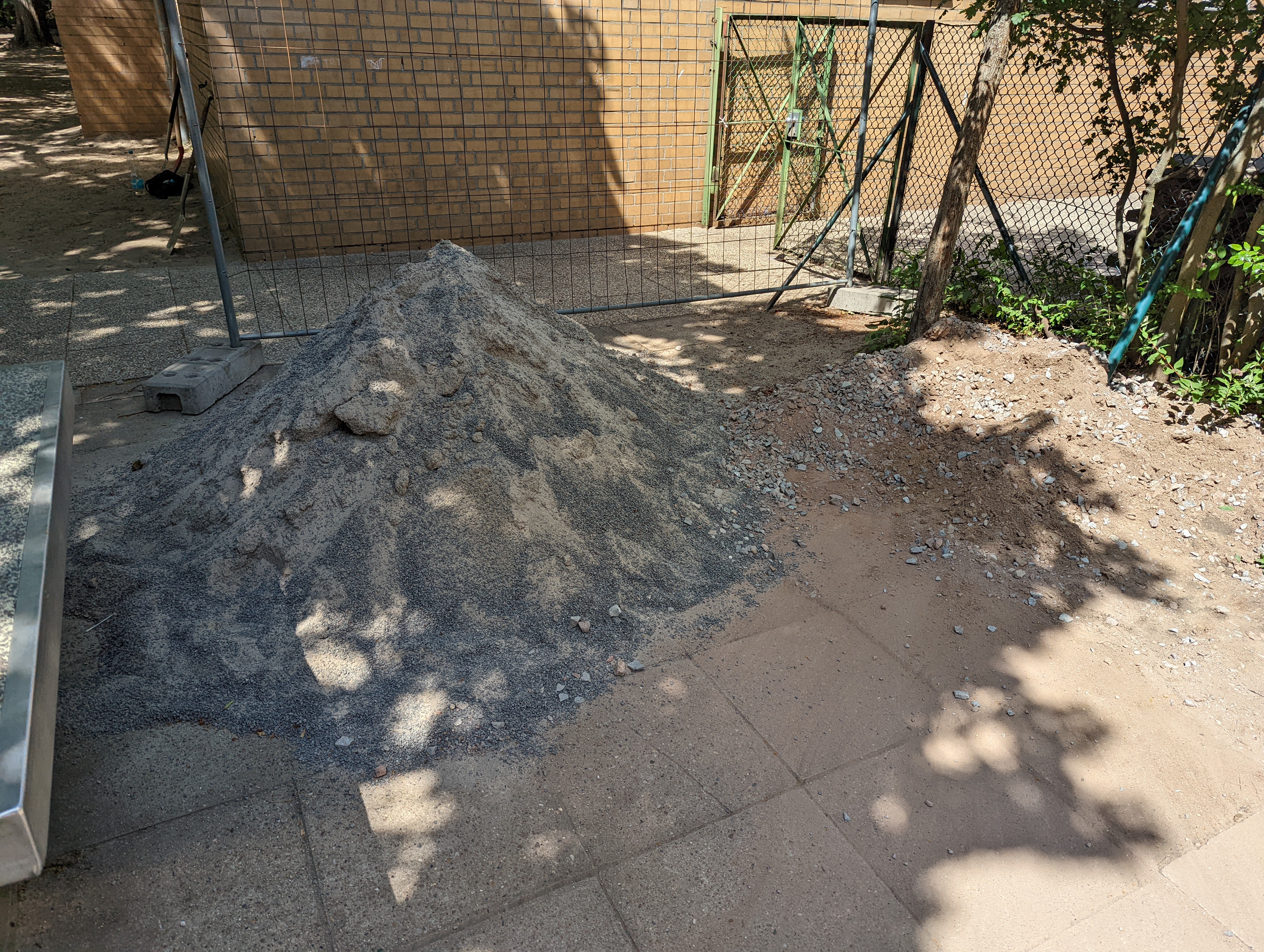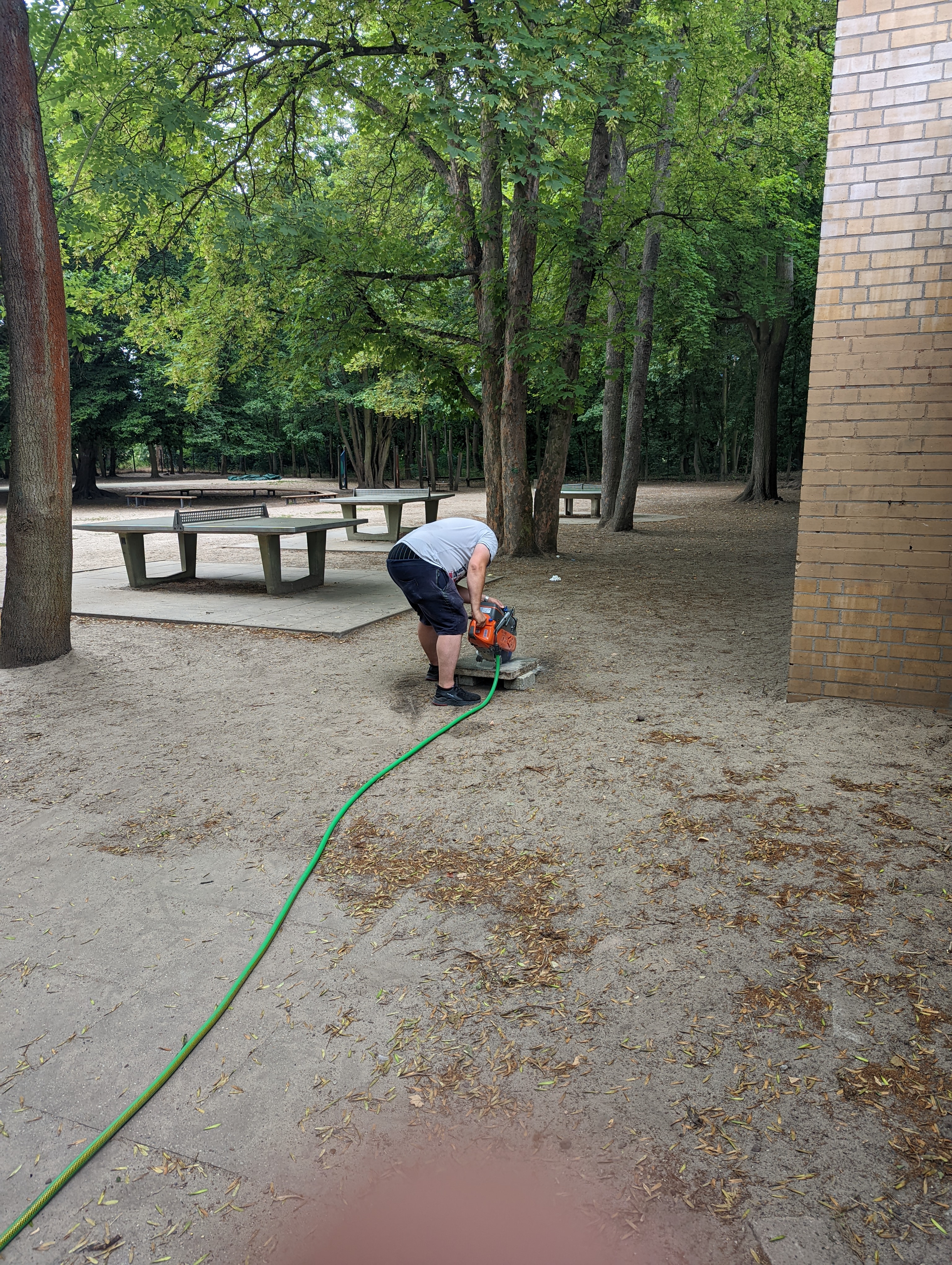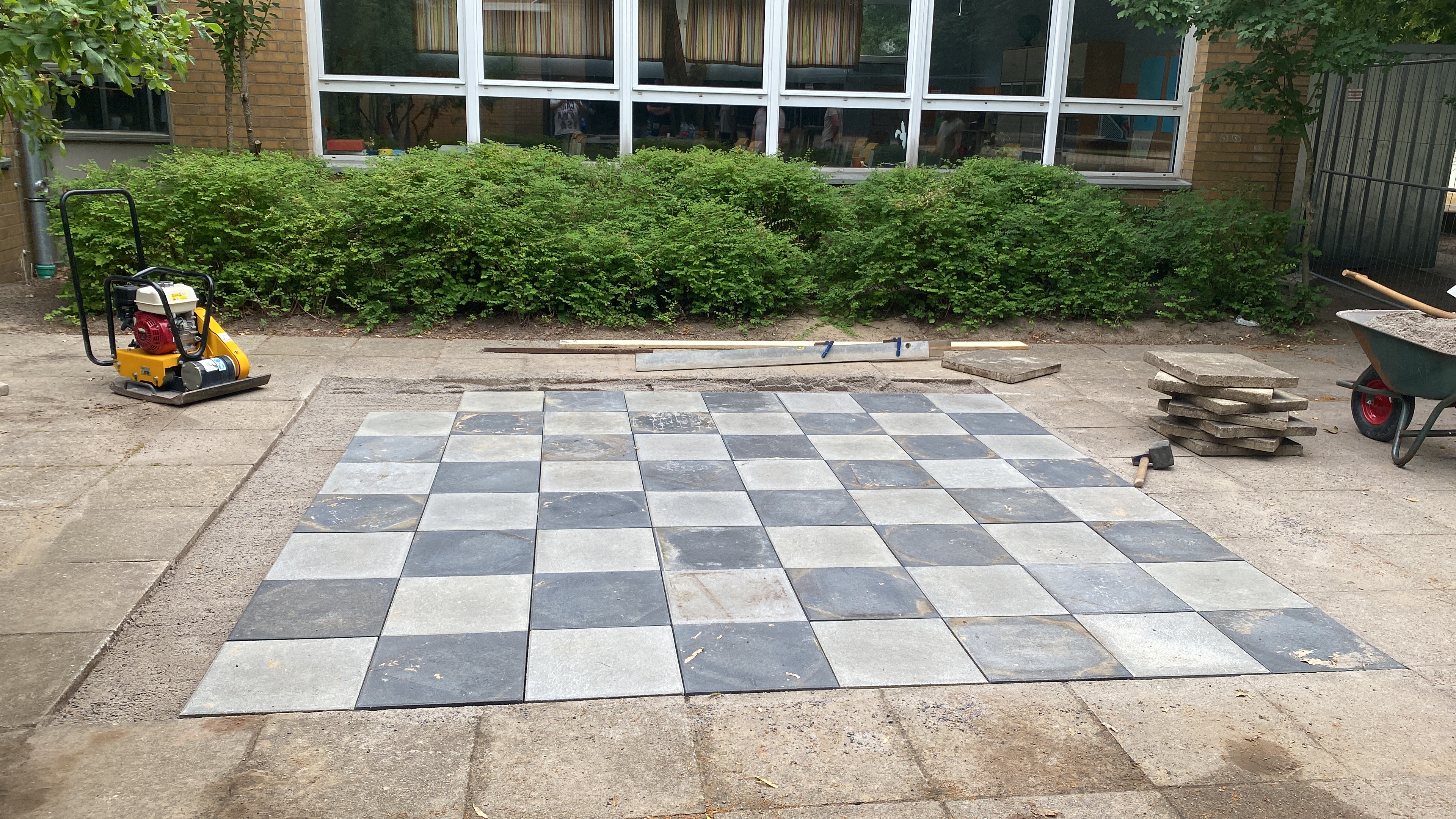 Dies war im Vorfeld nicht so einfach. Zuerst wurde eine alte und nicht mehr funktionstüchtige Tischtennisplatte entfernt, wobei das Fundament verblieb, da eine neue Platte errichtet werden sollte. Erst nach einigen Diskussionen wurde beschlossen ein Schachbrett zu bauen und der Bezirk entfernte auch das Fundament. Dann konnte der Förderverein tätig werden, in dem er nicht nur weitere Materialien und Werkzeug organisierte, sondern auch Eltern, um den Bau zu realisieren. Die Steinplatten selbst waren von einer alten Baustelle übrig und wurden von dem oben genannten Elternteil gesponsert. So wurde am zwei Samstagvormittagen, die sehr schweißtreibend und spaßig waren, das Schachbrett erstellt.