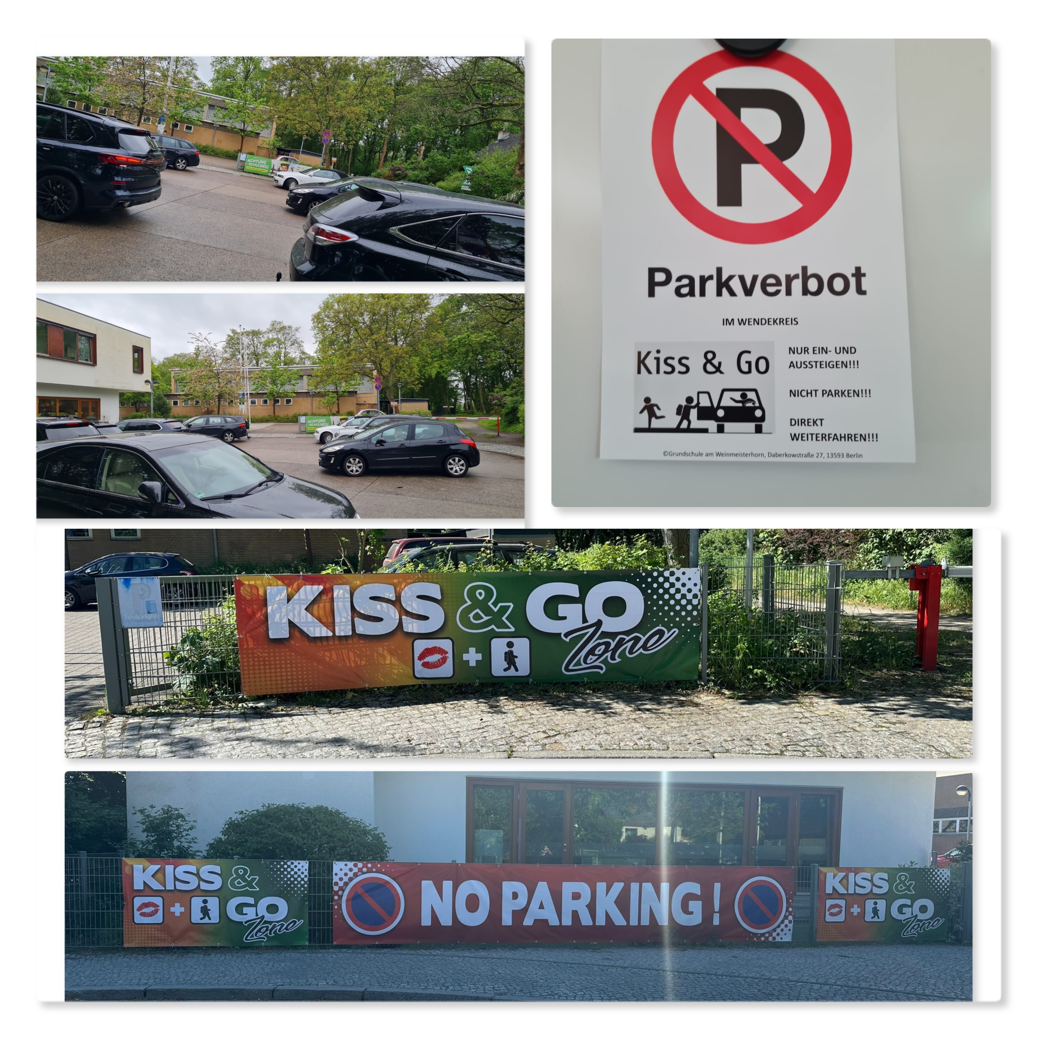 Da die Verkehrssituation in unserem Kreisverkehr stets miserabel war/ist (siehe Bilder oben links), wurde auf Initiative mehrerer Eltern ein Arbeitskreis initiiert, um zu prüfen wie man die Situation verbessern kann. Als Ergebnis wurden Plakate für die Zäune im Kreisverkehr entworfen und aufgehangen (siehe Bilder unten). Des Weiteren wurden Flyer (siehe Bild oben rechts) gedruckt und in den Klassen an die Schüler verteilt sowie besprochen. Der Förderverein war hier finanziell in der Umsetzung beteiligt. (2024)