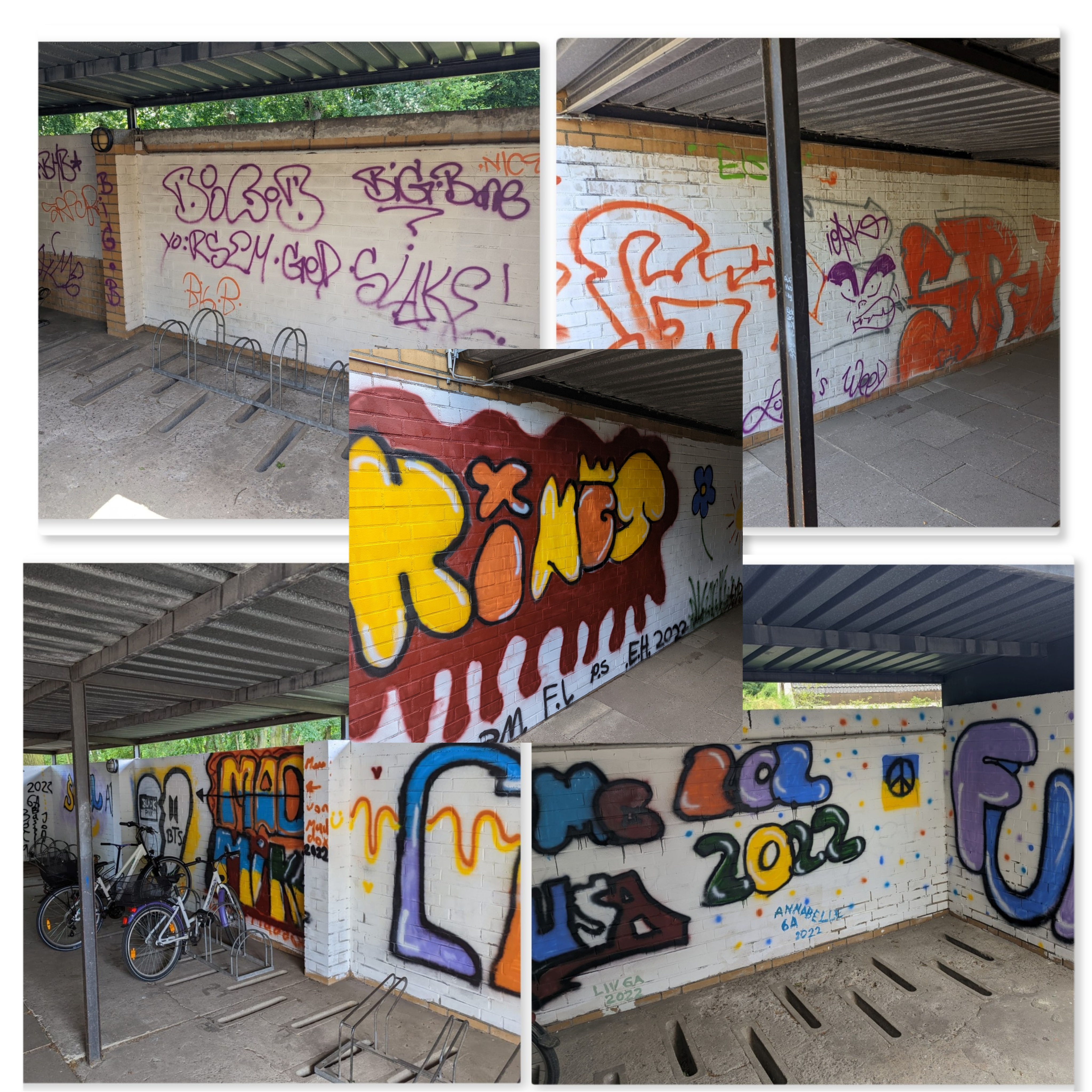 Die Sechsties vom Jahrgang 2022 wollten der Schule etwas Bleibendes schenken und beschlossen im Absprache mit der Schule die Wände des Fahrradunterstellplatzes neben der Sporthalle zu verschönern. Dies sollte im Rahmen eines Graffiti-Workshops passieren. Der Förderverein war hier untersützent dabei, um für die Kosten für die Farbe aufzukommen (2022).
